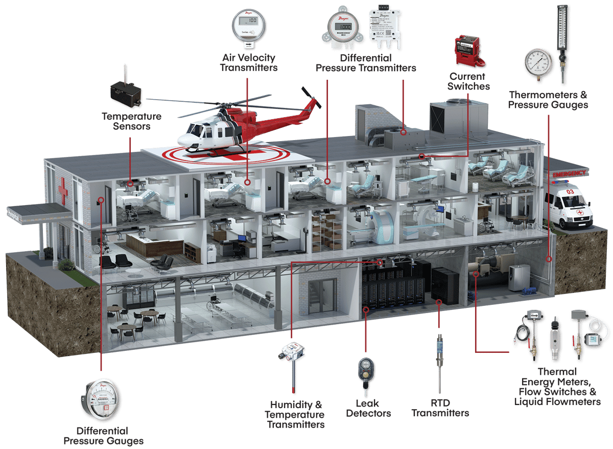 Nhiệt độ và độ ẩm ảnh hưởng trực tiếp đến sự thoải mái của bệnh nhân, khả năng phát triển của vi sinh vật và hiệu suất của thiết bị y tế nhạy cảm. Do đó, việc duy trì nhiệt độ và độ ẩm ổn định là cực kỳ quan trọng ở các khu vực như phòng chăm sóc sơ sinh hoặc phòng mổ. Các cảm biến kỹ thuật số giúp đảm bảo điều kiện môi trường luôn phù hợp với các quy định nghiêm ngặt.